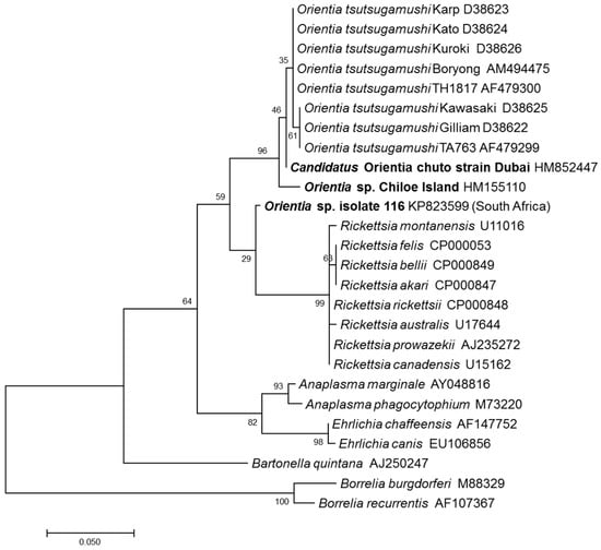 A second report of a scrub typhus case outside the Tsutsugamushi Triangle was that of a biologist working in Chiloè Island in southern Chile [18]. The individual reported being bitten by leeches, but not by ticks or mites. The patient had an eschar and febrile disease that responded to doxycycline treatment. Additionally, the acute and convalescent sample showed a seroconversion by IgG antibody against O. tsutsugamushi ELISA antigens (titer <100 to 400). Moreover, the partial gene sequence of rrs obtained from the patient’s eschar and rash biopsy was only 96.5% similar to the closest agent in GenBank, O. tsutsugamushi, whereas the rrs sequence divergence among O. tsutsugamushi strains is between 0.1 and 1%. Phylogenetic analysis based on the rrs showed Ca.O. chuto and the Orientia sp. from Chiloè Island were separate from O. tsutsugamushi species, but clearly closer to the strains classified within O. tsutsugamushi, compared with other rickettsiae (Figure 1).