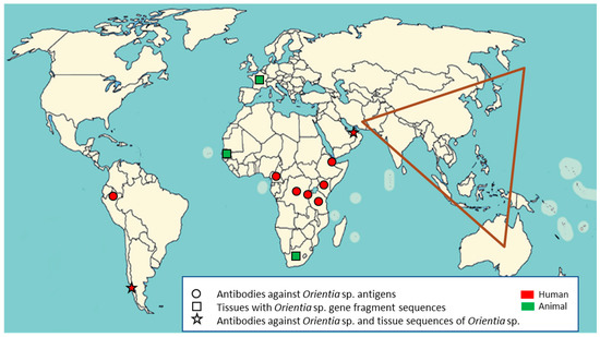 Human and animal serological and molecular evidence of Orientia spp. infections in new endemic regions of scrub typhus outside of the Tsutsugamushi Triangle (shown in brown).