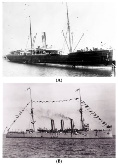 (A) The SS Talune shown in Napier, New Zealand in 1908, photo from https://nzhistory.govt.nz/media/photo/influenza-pandemic-hits-samoa, (Ministry for Culture and Heritage), updated 24 October 2014 and (B) The Challenger class light cruiser HMAS Encounter shown in Sydney, October 1913. Photo from http://www.navy.gov.au/hmas-encounter-i.