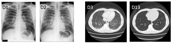 Chest X-rays upon admission (D1) and subsequent day (D2). Contrast-enhanced CT scan after oral and intravenous contrast administration at the day of hypotensive shock (D3), and post-treatment (D13).