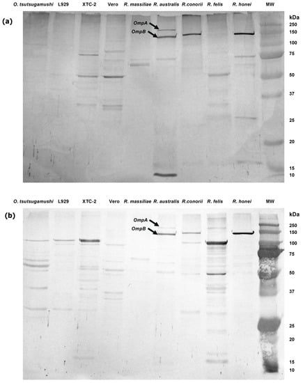 - Stenos, J.; Ross, B.; Feng, H.M.; Crocquet-Valdes, P.; Walker, D. Protein characterization of Australian spotted fever group rickettsiae and monoclonal antibody typing of Rickettsia honei. J. Clin. Microbiol. 1997, 35, 261–263. [Google Scholar] [PubMed]
