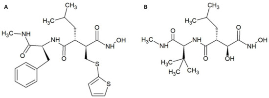 Other examples of promising small molecule inhibitors include the matrix metalloproteinase inhibitors batimastat (Figure 2A) and marimastat (Figure 2B) [35,36]. In a study by Arias et al., 200 µM of these molecules were incubated with 4 LD50s of Echis ocellatus venom and co-injected into the tail vein of CD-1 mice [37]. The molecules prolonged survival, but did not provide full protection. Nevertheless, administration of batimastat inhibited the haemorrhagic (IC50 = 30 µM), in vitro coagulant (IC50 = 0.05 µM), proteinase (IC50 = 2.6 µM), and defibrinogenating (IC50 = 200 µM) activities of the venom from an E. ocellatus specimen from Cameroon. IC50s for E. ocellatus venom from a specimen from Ghana were also determined; however, these vary somewhat from the values reported for the specimen from Cameroon. Fast administration of batimastat resulted in increased inhibition of haemorrhage. On the other hand, a delay in administration led to greater inhibition of defibrinogenation, which could be completely inhibited by a 60-min-delayed injection of 200 µL of 500 µM batimastat. Batimastat was more effective in inhibiting haemorrhagic activity than marimastat, and conversely marimastat was better at inhibiting defibrinogenating activity than batimastat. Five hundred micromoles of batimastat provided full protection against 1.5 LD50 of E. ocellatus venom when the venom was injected intramuscularly immediately followed by an intramuscular administration of batimastat. With a delay of 15–60 min in administration, batimastat no longer provided full protection, although it still prolonged survival [37]. Both compounds contain hydroxamate groups, which might by hydrolysed in plasma [38]. However, batimastat and marimastat have previously been investigated as potential cancer drugs. One study found that the half-life of batimastat was 19.1 days after intraperitoneal injection in humans (batimastat is not orally available) [39], and another study found that the half-life of marimastat after oral administration in humans is 8–10 h [40]. As these studies indicate that the half-life of batimastat and marimastat is on par with existing antivenoms, these small molecule inhibitors seem to be promising as supplements to existing antivenoms.