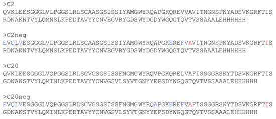 Overview of mutations introduced in VHHs by Anderson et al. to improve the thermal stability of the C2 and C20 nanobodies [51]. The sequences of the wild-type antibodies C2 and C20 are shown. The sequences of the mutated C2neg and C20neg antibodies are also shown, with mutations highlighted in blue. Finally, C2neg and C20neg were further mutated by the introduction of additional disulphide bridges to form C2neg+ and C20neg+. This was accomplished by mutating the amino acids highlighted in red into cysteines. Adapted with the author’s permission.
