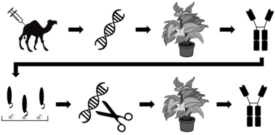 Schematic overview of the strategy employed by Julve Parreño et al. [53]. Dromedaries were immunised with a mixture of venoms. VHH sequences were extracted from the immunised animals, cloned into a viral vector, and used to infect Nicotiana benthamiana specimens. The plant-expressed VHHs were evaluated in vivo and subjected to phage display experiments involving four venom fractions from Bothrops asper (representing the four important major toxin families of this venom) to accumulate high affinity VHHs. The 36 best VHH binders were converted to human-dromedary chimeric antibodies, which were expressed in N. benthamiana as well and tested in vivo.