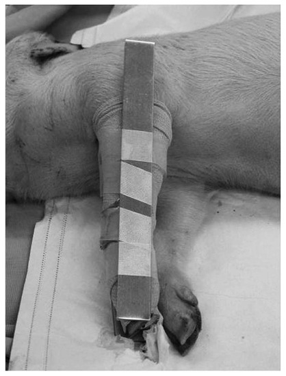 Pressure immobilization bandage consisting of an ace bandage wrapped beginning at the site of bite and wrapping the entire extremity, followed by a splint, in a porcine model of eastern coral snake envenomation. From [24], used with permission of the publisher.