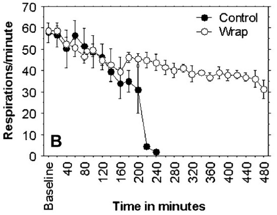 A controlled study of pressure immobilization bandages (Figure 1) in anesthetized pigs injected with eastern coral snake (Micrurus fulvius fulvius) venom had an endpoint of survival to eight hours and used histological analysis of biopsies of the injection site [24]. Four of five subjects in the treatment group survived to 8 h, while no control group subjects survived. Mean time to onset of respiratory compromise was 170.4 ± 33.3 min in the control group (Figure 2). None of the pigs had histologic changes at the envenomation site consistent with ischemia or necrosis.
