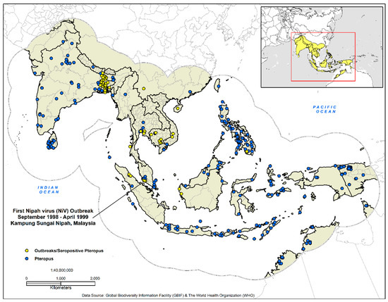 - Walsh, M.G. Mapping the risk of Nipah virus spillover into human populations in South and Southeast Asia. Trans. R. Soc. Trop. Med. Hyg. 2015, 109, 563–571. [Google Scholar] [CrossRef] [PubMed]