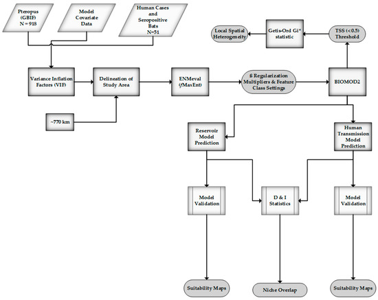 This study has several limitations and inherent challenges due to the multiple stages of analysis. The first is related to our choice of model variables, specifically the density of livestock. The initial outbreak in Malaysia was associated with the presence of pigs serving as an intermediate reservoir for the virus; however, Bangladesh is a majority Muslim country with a very low pig population density. This difference in livestock comparisons between nations explains the (0.085) variable importance of pigs in this study, due to the majority of human cases being documented in Bangladesh. Second, we are confident that the reported number of NiV human cases has been underreported throughout the study area. There are two reasons for this; one is that the available data on NiV in Bangladesh is biased towards those infections acquired during outbreaks only. The second possible explanation for underreported cases is that meningoencephalitis is a common cause of hospitalization in Bangladesh, it is plausible that NiV infection has been overlooked by medical professionals [33]. Raising awareness of the dangers of drinking raw date palm sap is an approach that may reduce the risk of zoonotic transmission. However, this may not be possible especially in rural areas. Third, ENMeval and BIOMOD2, as with any study that incorporates species distribution modeling (SDM), have inherent limitations. ENMeval features extended computation times due to the hundreds of replicate runs performed, a process intimately linked to the number of occurrence points and environmental variables in each analysis. Model evaluation methods like the area under the curve AUC (ROC) statistic is considered a relative standard of the geographic dissemination for a given study area and will discriminate occurrence from background localities. Background locations are treated as pseudo-absences for the evaluation and not the model fitting stage. The AUC has been criticized because it does reveal goodness-of-fit to provide information about the spatial distribution of model errors [133]. We recommend that the models presented here be interpreted with caution because they do not take into consideration the potential interaction between Pteropus bats and humans. We admit that even in geographies designated as high risk, it is difficult to quantify and predict with certainty zoonotic transmission. It must be emphasized that the presented maps do not enable the assessment of secondary transmission risk in human populations. In light of the reported results, the eco-epidemiology and ecology of NiV needs to be further explored.
