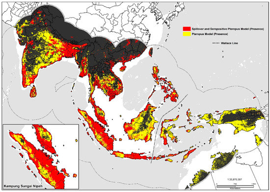 In recent decades, South and Southeast Asia have become the location of emerging and re-emerging infectious diseases, due to a combination of inadequate public health systems, rapidly expanding human populations, and an abundance of potential wildlife hosts [50]. Future efforts to describe the geographic variation in the disease transmission risk of NiV infection regionally would benefit from an understanding of the disease biogeography of the primary host Pteropus, and of the environmental characteristics of NiV transmission localities. The primary aim of this study was to: (1) provide contemporary disease maps that delineate the most significant risk for NiV in South and Southeast Asia; (2) identify those abiotic and biotic features associated with increased risk; and (3) to evaluate geostatistical models to ascertain varying degrees of model overlap in geographic and environmental space. Because of the imminent public health threat associated with NiV, the need for detailed risk maps is necessary to improve disease surveillance, control systems, and to further, minimize human mortality, long-term morbidity, economic distress, and spillover events.