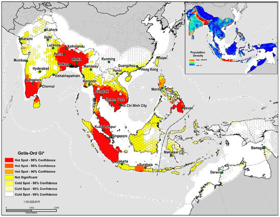 In measuring spatial autocorrelation based on the TSS quality threshold (<0.5) values, the presence of high positive local spatial heterogeneity is strong in the 90–99% CL (GiZscore: 5.33; GiPvalue: 0.0052) and exhibits clustering and spatial dependency at eight locations, the southeastern Indo-Gangetic Plain, Indonesia, Peninsular Malaysia, the Greater Mekong Subregion, southern India, northern Sri Lanka, the Irrawaddy Delta, and the Philippines (Figure 4). The land area deemed as high risk for disease transmission totaled 2,963,178 km2 or 19% of the study area. Niche equivalency tests of the D metric equaled a value at 0.64 indicating a relatively high degree of overlap between models. The I statistic when solely based on the probability distribution was much higher at 0.89; inferring that a very high level of similarities exists in environmental ( and geographic space (. In sum, our results indicate that both models share strong similarities in their ecological niches.