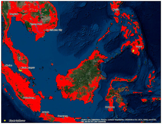 This study covered 15,595,674 km2 (17.55° S to 38.55° N, 64–146° E) (Figure 1) and included the countries of Afghanistan, Australia, Bangladesh, Brunei, Cambodia, China, Hong Kong, India, Indonesia, Laos, Macau, Malaysia, Maldives, Myanmar, Nepal, Pakistan, Papua New Guinea, the Philippines, Singapore, Sri Lanka, Taiwan, Thailand, Timor-Leste, and Vietnam. An essential element in the development of ecological niche models are hypotheses of the areas (M) that are potentially accessible to the species; a theory incorporated into the three-factor conceptual ‘BAM’ framework (biotic, abiotic, movement) [51,52]. With this in mind, we delineated our study area as recommended by Peterson and Samy [53]. South and Southeast Asia are home to an estimated 2,884,289,620 people or 39% of the world population and produces a vast economic output estimated annually at $9.107 trillion (GDP—nominal) [54,55,56] (Figure 1).