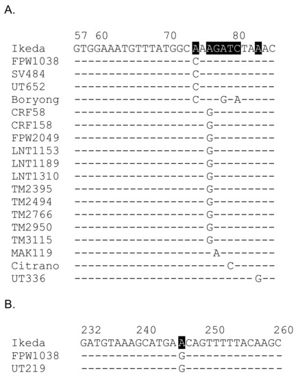 - Tamura, A.; Takahashi, K.; Tsuruhara, T.; Urakami, H.; Miyamura, S.; Sekikawa, H.; Kenmotsu, M.; Shibata, M.; Abe, S.; Nezu, H. Isolation of Rickettsia tsutsugamushi antigenically different from Kato, Karp, and Gilliam strains from patients. Microbiol. Immunol. 1984, 28, 873–882. [Google Scholar] [CrossRef] [PubMed]