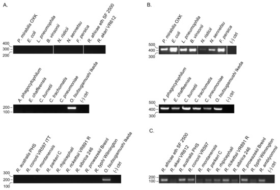 - Furuya, Y.; Yoshida, Y.; Katayama, T.; Yamamoto, S.; Kawamura, A., Jr. Serotype-specific amplification of Rickettsia tsutsugamushi DNA by nested polymerase chain reaction. J. Clin. Microbiol. 1993, 31, 1637–1640. [Google Scholar] [PubMed]