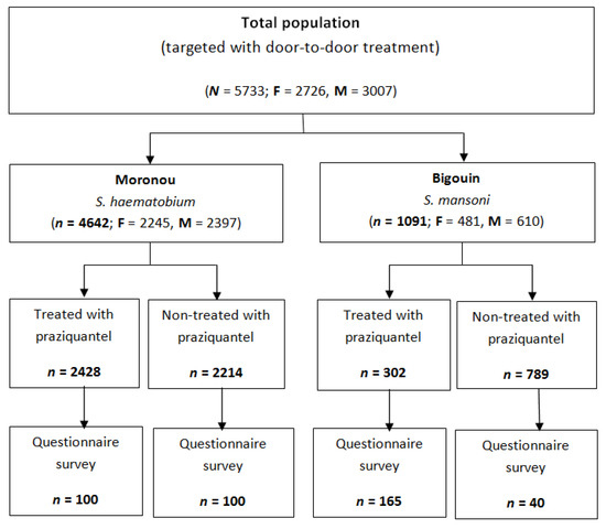 - Sangho, H.; Dabo, A.; Sidibe, A.; Dembele, R.; Diawara, A.; Diallo, A.; Konate, S. Coverage rate and satisfaction of populations after mass treatment with praziquantel and albendazole in Mali. Mali Med. 2009, 24, 21–24. [Google Scholar] [PubMed]