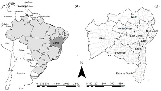 Study area: (A) location of the Bahia state; (B) Bahia state with its nine regions and 417 municipalities.