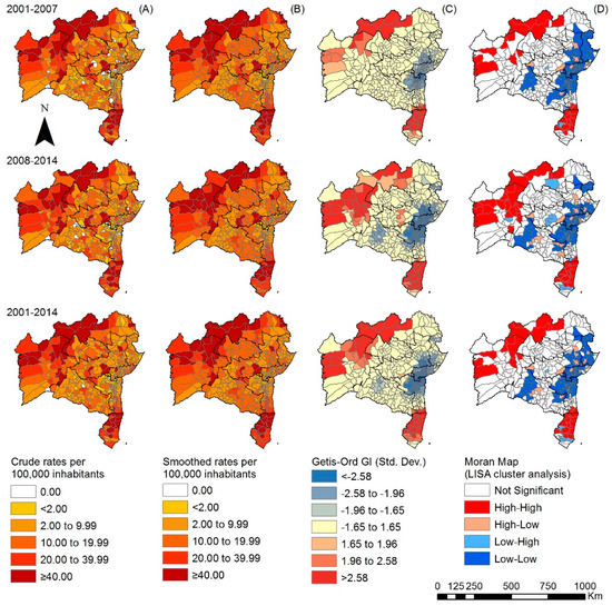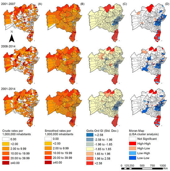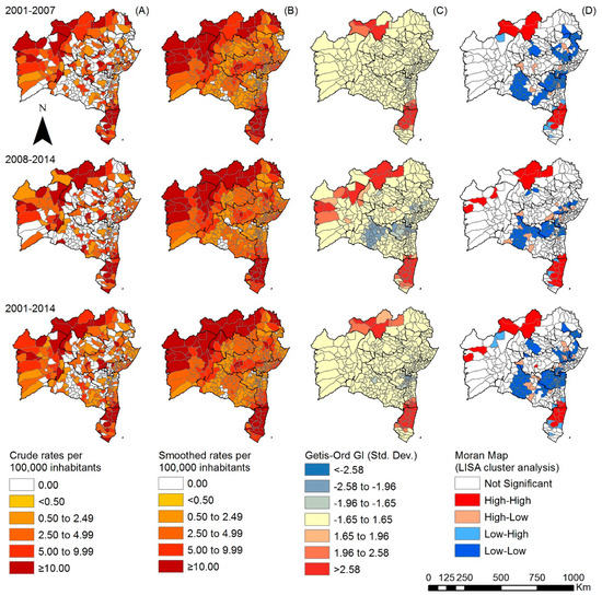 Spatiotemporal distribution of the overall new case detection rate of leprosy in <15 year-olds by municipality, Bahia state, 2001–2014: (A) crude detection rates of new cases of leprosy (per 100,000 inhabitants); (B) Bayesian-smoothed detection rate (per 100,000 inhabitants); (C) hot-spot analysis (Getis-Ord Gi*) and (D) LISA cluster analysis (Moran Map).