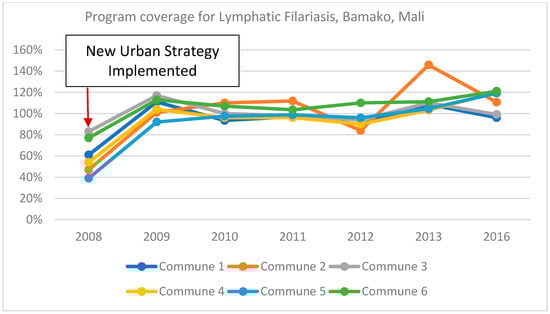 Attention to the heterogeneity of urban areas is also important in determining who should deliver treatment, the numbers needed and how workers are motivated and supported. Experience supports the value of matching MDA workers to different target populations such that trust and respect are maximized [19,25]. For example, based on their work in urban informal settlements in Kisumu, Kenya, Odhiambo, et al. recommended a community directed intervention (CDI) approach in urban, informal settlements, whereby community members decide who will distribute the drugs, how responsibilities will be allocated between MDA workers, as well as the most appropriate mobilization techniques, the timing of MDA and how drugs will be distributed [22]. Urban MDA campaigns in Bamako, Mali, identified nurses and nursing students as especially effective because their training left them better equipped to handle complex questions and allay any concerns about the MDA in a relatively well-educated population [9]. Figure 2 shows the increase in program coverage for LF that occurred as a result of this and other urban-specific adaptation in Bamako.