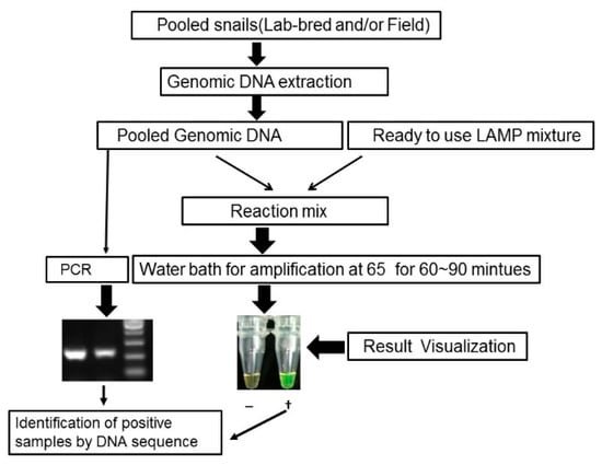 - Kumagai, T.; Furushima-Shimogawara, R.; Ohmae, H.; Wang, T.P.; Lu, S.; Chen, R.; Wen, L.; Ohta, N. Detection of early and single infections of Schistosoma japonicum in the intermediate host snail, Oncomelania hupensis, by PCR and loop-mediated isothermal amplification (LAMP) assay. Am. J. Trop. Med. Hyg. 2010, 83, 542–548. [Google Scholar] [CrossRef]