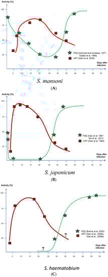 S. mansoni reactions to ART according to experiments by Xiao et al. [46] and to PZQ by Gönnert and Andrews [48], were confirmed by Sabah et al. [47]; S. japonicum to ART by Xiao et al. [39] and to PZQ by Xiao et al. [49], were confirmed by Wu et al. [50]; and S. haematobium to PZQ by Botros et al. [51]. Note that S. haematobium reactions to ART represent indirect information on parasite susceptibility based on tegumental damage [52,53] and cannot therefore be directly compared with other measurements presented in this figure.