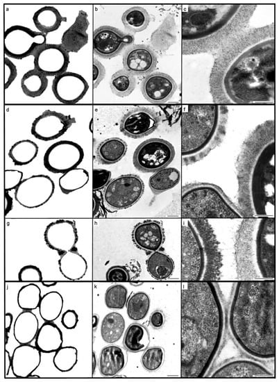 Transmission electron microscopy of cultured Cryptococcus neoformans cells: American Type Collection (ATCC) 34875 (a–c); case 1 isolate (d–i); case 2 isolate (j–l); where (a,d,g,j) (internal structure digitally subtracted) are paired with (b,e,h,k) (complete original images) in order to highlight capsule thickness variation. Figures (c,f,i,l) illustrate the homogeneous, delicately fibrous, regular capsule of the ATCC control (c); the variably osmiophilic, peripherally matted or loosely fibrous capsules of isolate 1 (f,i); and the thin, tomentose capsules of isolate 2 (l). Scale bars = 1 µm (b,e,h,k) and 0.5 µm (c,f,i,l).
