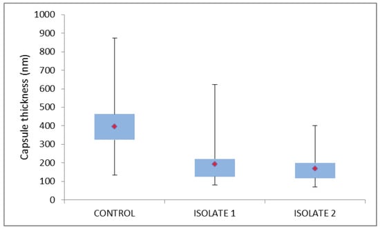 Comparison of capsule dimensions measured from median sections through cultured cells (n = 100), with the mean capsule thickness for each culture indicated by the red diamond within the box (2nd and 3rd quartiles), with the whiskers indicating the entire range of measured capsule thickness.