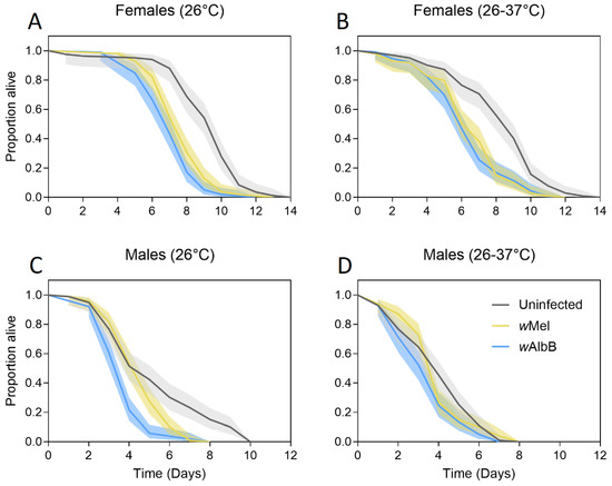 Adult starvation tolerance of female (A,B) and male (C,D) Ae. aegypti that were reared at either 26 °C (A,C) or 26–37 °C (B,D). Mosquitoes were either uninfected (gray lines) or infected with the wMel Wolbachia strain (yellow lines) or the wAlbB Wolbachia strain (blue lines). Solid lines represent the proportion of adults alive each day, while shaded areas are 95% confidence intervals.