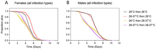 Adult starvation tolerance of female (A) and male (B) Ae. aegypti that were reared under different temperature regimes across two generations. Mosquitoes were reared at 26 °C in both generations (gray lines), 26–37 °C in both generations (purple lines), 26–37 °C in the first generation and 26 °C in the second generation (red lines) or 26 °C in the first generation and 26–37 °C in the second generation (yellow lines). Data for all Wolbachia infection types were pooled in these comparisons. Solid lines represent the proportion of adults alive each day, while shaded areas are 95% confidence intervals.