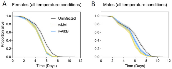Adult starvation tolerance of female (A) and male (B) Ae. aegypti with different Wolbachia infection types in the second generation. Mosquitoes were either uninfected (gray lines) or infected with the wMel Wolbachia strain (yellow lines) or the wAlbB Wolbachia strain (blue lines). Data for all rearing temperature regimes were pooled in these comparisons. Solid lines represent the proportion of adults alive each day, while shaded areas are 95% confidence intervals.