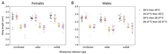 Wing length of female (A) and male (B) Ae. aegypti from three Wolbachia infection types (uninfected, wMel-infected or wAlbB-infected) that were reared under different temperature regimes across two generations. Mosquitoes were reared at 26 °C in both generations (gray dots), 26–37 °C in both generations (purple dots), 26–37 °C in the first generation and 26 °C in the second generation (red dots) or 26 °C in the first generation and 26–37 °C in the second generation (yellow dots). Error bars are medians and 95% confidence intervals.