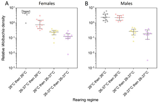 Relative Wolbachia density of wMel-infected male and female Ae. aegypti that were reared under different temperature regimes across two generations. Mosquitoes were reared at 26 °C in both generations (gray dots), 26–37 °C in both generations (purple dots), 26–37 °C in the first generation and 26 °C in the second generation (red dots) or 26 °C in the first generation and 26–37 °C in the second generation (yellow dots). Error bars are medians and 95% confidence intervals.