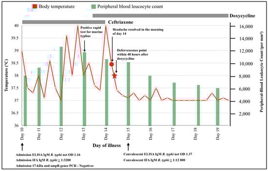 In view of the clinical history and demographic considerations, the patient was treated empirically for leptospirosis using intravenous ceftriaxone, (2 g once a day). However, the initial leptospiral microagglutination test (MAT; using three local serovar and 17 serovar recommended by WHO) [15], dengue NS1, IgM and IgG (PanBio Dengue Capture ELISA), blood films for malaria and blood culture taken upon admission (BACTEC 9240, Bactec) were all negative. Furthermore, there was persistence in symptoms and worsening septic parameters, despite antibiotic therapy, which prompted the need to reconsider the initial diagnosis, one of which included murine typhus and other rickettsial diseases (Figure 1). Serological tests using rapid diagnostic kits for both scrub typhus (InBios scrub typhus IgM) and murine typhus (GenBio R. typhi) were both performed and yielded positive results in the later test. Ceftriaxone treatment was ended and oral doxycycline was initiated, with a loading dose of 200 mg followed by 100 mg twice a day for seven days (Figure 1). Symptom relief was achieved within 24 h of doxycycline administration. (Figure 1).