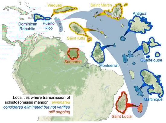 An overview of the localities with a history of being endemic for schistosomiasis mansoni is provided in Figure 1. Two countries in the Caribbean region, Saint Lucia and Suriname, are still considered endemic for schistosomiasis with possible residual transmission whereas six additional countries and territories of Antigua and Barbuda, Guadeloupe, Martinique, Montserrat, Puerto Rico and Dominican Republic have likely eliminated transmission, but their status needs to be verified by compiling an elimination dossier and/or conducting epidemiological surveys based on WHO recommendations [9]. There are a few islands where schistosomiasis was endemic that became free of the parasite through cessation of transmission. Schistosomiasis cases ceased being detected on the island of Saint Martin/Sint Maarten from 1929 onwards with surveys published in 1980 indicating the absence of snail habitats on the island [3,10]. St Kitts was highly endemic in the early 1900s with more than 25% of the population estimated to be infected in 1932 but by 1959 onwards schistosomiasis was no longer considered a public health problem [11,12]. Schistosomiasis mansoni was eliminated from the small island of Vieques near Puerto Rico in 1962 [13]. Caribbean localities without a history of schistosomiasis include Anguilla, St Barthélemy, Saba, Sint Eustatius, Nevis, Dominica, St Vincent and the Grenadines, Grenada, Barbados, Tobago and Trinidad, Aruba, Bonaire, Curaçao and the British and U.S. Virgin Islands in the Lesser Antilles as well as the Greater Antillean countries/territories of Jamaica, Cuba, Cayman Islands and Haiti, nor in Belize, Guyana or French Guiana which are also included in the Caribbean region [3,14].