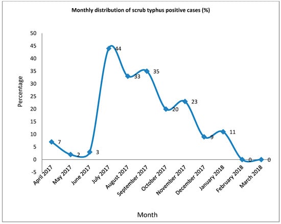 Monthly distribution of scrub typhus positive cases (percentage of total) indicating the highest percentage of positive cases in the month of July.