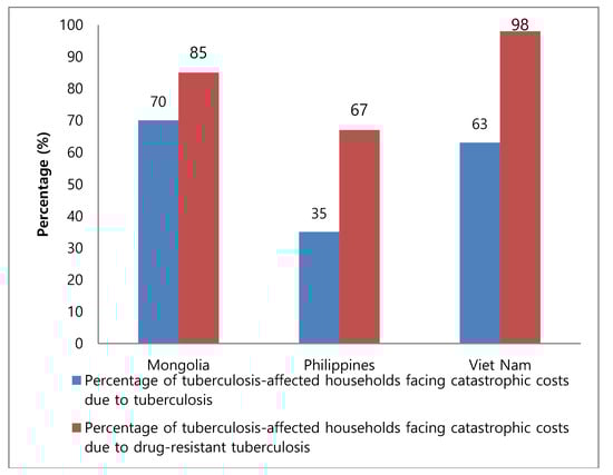 The percentage of TB-affected households experiencing catastrophic costs was 70% in Mongolia, 35% in the Philippines, and 63% in Viet Nam (catastrophic costs due to TB are defined as total costs borne by patients exceeding a given threshold where 20% has been used as the threshold according to the current trend [5]). When limited to DR-TB patients, the percentage increased to 85% in Mongolia, 67% in the Philippines, and 98% in Viet Nam (Figure 1).