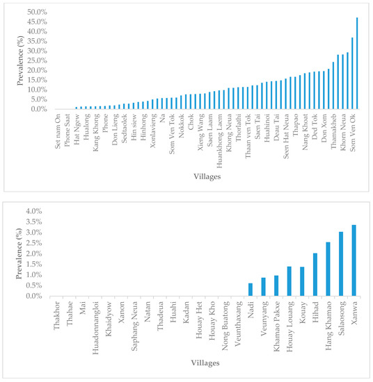Prevalence of schistosomiasis in Khong (top) and Mounlapamok (bottom), detected by an approach based on a single Kato-Katz smear within the MoH and World Health Organization (WHO) survey in 2003.