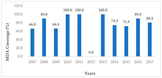 Mass drug administration (MDA) coverage at the S. mekongi endemic communities in Lao PDR in the period 2006–2017.