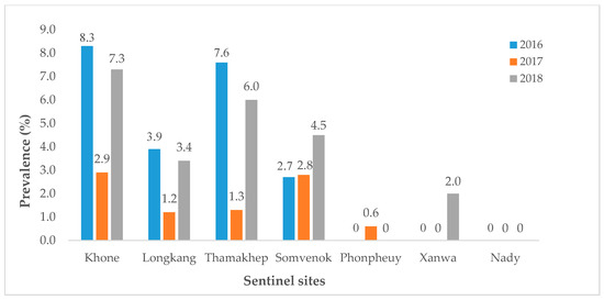Schistosoma mekongi infection prevalence at the seven sentinel sites in the districts Khong and Mounlapamok in the period 2016–2018.