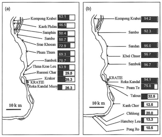 Comparison of results of stool examination and ELISA conducted in villages along the Mekong River in the Kratié Province [14]. Positive ratios (%) are represented by the numbers in the bar charts. (a) Prevalence of schistosomiasis mekongi, as determined by stool examination during 1994–1995 [17], and (b) prevalence of schistosomiasis mekongi, as determined by ELISA using S. japonicum soluble egg antigen (SEA) in the period 1997–1998 [14].