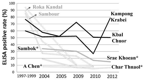 Stool examinations were carried out using the Kato-Katz technique [37]. The SMP–ELISA technique was used for surveys in sentinel villages designated by the National Schistosomiasis Control Program (in Achen, Char Thnaol, Srae Kheun and Sambok in Kratié Province as well as several additional spot-check sites). As shown in Figure 5, ELISA-positive rates in sentinel villages and at two additional sites (Roka Kandal and Sambour) dramatically decreased to below 20%, while ELISA-positive rates remained high (>50%) at two spot-check sites (Kampong Krabei and Kbal Chuor).