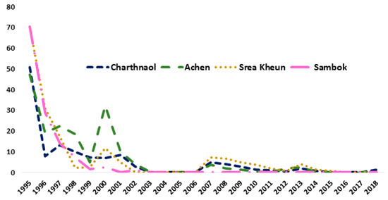 Since 1995, the MDA together with the IEC campaigns have been conducted annually in the two provinces endemic for S. mekongi. In Kratié Province, four sentinel villages were followed-up annually. Figure 6 shows the rapid decrease in the prevalence of S. mekongi infection from 1995 to 2018. The S. mekongi prevalence at four sentinel surveillance sites in Kratié Province dropped dramatically from 70% in 1995 to less than 1% in 2018. According to the CNM annual reports no new patients with S. mekongi infection were diagnosed in these villages over the last few years, demonstrating the positive impact of the intervention.