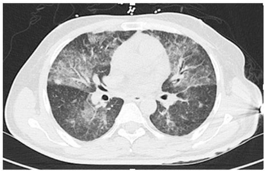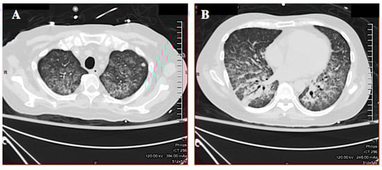 Case 2: CT of the chest showing extensive ground glass and patchy parenchymal opacities throughout the bilateral lungs; the differential diagnosis included opportunistic infections (pneumocytosis, cytomegalovirus), alveolar hemorrhage, and pulmonary edema.