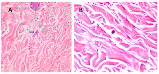 Case 1. (A) Longitudinal section of infective filariform Strongyloides stercoralis within subcutaneous tissue in skin biopsy of abdominal wall, stained with H&E. Image taken at 200× magnification. Note the absence of inflammatory cells []. (B) Cross section of infective filariform Strongyloides stercoralis within subcutaneous tissue in skin biopsy of abdominal wall, stained with H&E. Image taken at 400× magnification.
