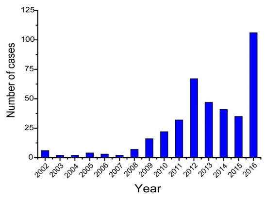 Number of melioidosis cases by year identified during surveillance, Hainan, China, 2002–2016.