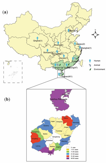 Location of Burkholderia pseudomallei and melioidosis cases in China. (a) The distribution of endemic areas (n = 4, with green shading) and melioidosis cases in mainland China, with locations of environmental isolation of B. pseudomallei and indigenous or imported human/animal cases of melioidosis indicated (The number of human cases for each province was indicated in parentheses. The patients outside the four endemic provinces all have a history of residence or travel to Hainan or overseas endemic areas and thus are deemed as imported cases); (b) The distribution of melioidosis cases according to different prefectures in Hainan (data only available for 289 of 401 cases) and in the Leizhou Peninsula (46 cases) of Guangdong, China.