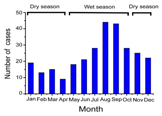 Monthly distribution of 289 melioidosis cases across 13 years (2002–2014) in Hainan, China.