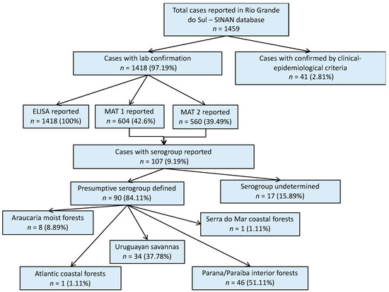 A total of 1459 human leptospirosis cases were reported in the SINAN database for Rio Grande do Sul within the study period; 97% of them with laboratory confirmation (Figure 1). Among all leptospirosis cases in the SINAN database, ELISA results were reported in 1418 cases (97.12% of all total cases). MAT results were reported in 604 (41.39%) cases, of which 560 had the second MAT test results also reported (MAT 2). Serovar information was available for only 107 (9.19%) single or paired sample results. For 90 of these cases, it was possible to define the presumptive infecting serogroup using the methodology previously described, and then group the cases according to their geographical location within each ecoregion (Figure 1). Cases with the reported presumptive infecting serogroup, were primarily from the Parana–Paraiba ecoregion (51.1%), followed by the Savanah (37.8%).