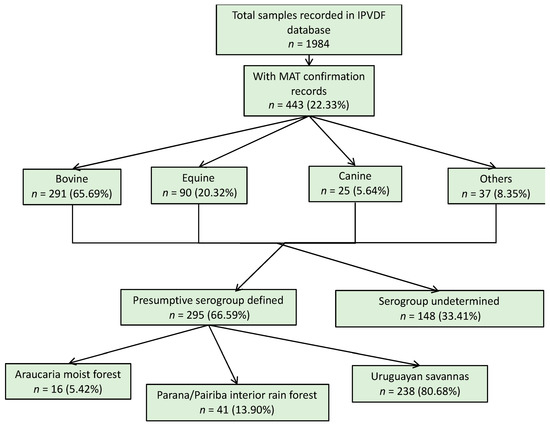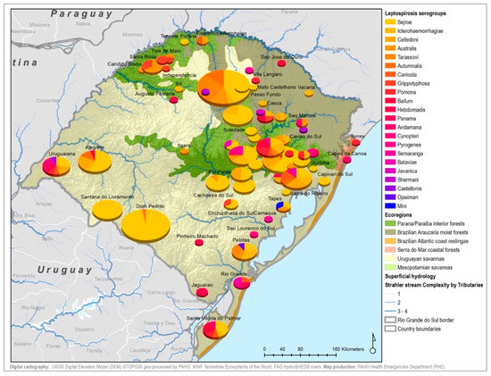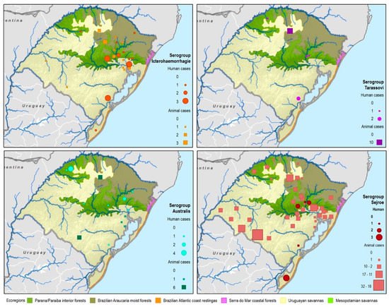 Furthermore, according to previous studies [9,14], human leptospirosis infections are usually a reflection of the serogroups maintained by the animal population in the region, therefore highlighting the need for serovar-specific vaccine development for human in high-risk populations and areas. Disease mapping and establishing the profile of serogroups circulating is the first step for further understanding both the magnitude and complex epidemiology of the disease, along with its distribution within the study area of Rio Grande do Sul state. The objective of this study was to identify the presumptive infecting Leptospira serogroups in human and animal cases and describe their presence by species in the various ecoregions in the state of Rio Grande do Sul, Brazil.