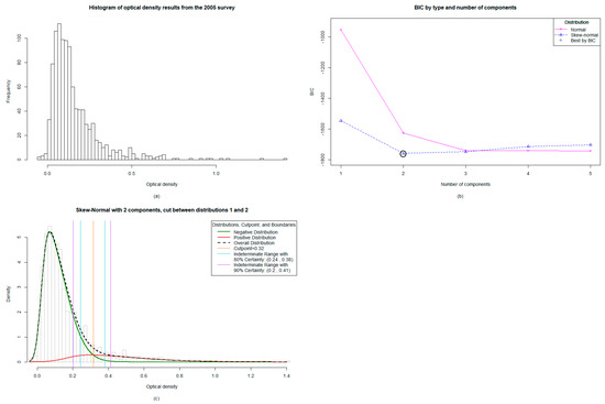 Mixture modelling was conducted to determine cut-offs and indeterminate ranges for the datasets from the 2005 and 2008 surveys. Models were parameterized to allow for one through five components (also known as “subpopulations”) to be fit using either normal or skew-normal distributions. It should be noted that while mixture modelling is a robust statistical technique, the sample sizes required are larger than are needed for more common statistical techniques. In particular, mixture modelling using the skew-normal distribution relies on asymptotics to calculate standard errors, which may not be reliable unless the sample size is large [23]. The necessary sample size for mixture modelling is highly dependent on the characteristics of the underlying subpopulations, so there is not an explicit rule or formula to determine what constitutes a prohibitively small sample size. However, in papers which examine mixture model performance, samples of less than 100 are rarely used when modelling normal distributions and samples of less than 200 are rarely used when modelling skew-normal distributions [24,25,26]. For the majority of these studies, utilizing either normal or skew-normal distributions, there are over 1000 samples [24,25,26]. Since the sample size of the 2008 survey (n = 187) approached the minimum sample used in skew-normal examples, we opted to still utilize the skew-normal distribution, however to apply a higher level of scrutiny to the results of skew-normal models for this dataset.