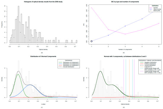 Taking this into consideration, after models were parametrized, the best fitting model was chosen by optimizing the Bayesian Information Criterion (BIC). If a two-component model was optimal, the cut-off was set deterministically at the point where the conditional probability of belonging to either component was equally likely (referred to herein as the “absolute” cut-off). If the optimal model had only one component, this would indicate that all of the observations are part of the same subpopulation (e.g., all negative) and, hence, a cut-off is not needed. Conversely, if the optimal model had more than three components, the user must choose between which two components to set the cut-off, based on biological knowledge, historical context or a prior knowledge of plausible cut-off values. Using either the deterministic or user-informed cut-off, an indeterminate range was then calculated such that observations which could not be classified to the positive or negative component with greater than 80% certainty were labeled as “indeterminate”. Put another way, if a point falls right on the absolute cut-off, there is a 50% chance of misclassification (as the probability of belonging to either component is equally likely by definition); if a point falls right on the 80% bound of the indeterminate range, it has a likelihood of misclassification of 20%. For example, if an absolute cut-off value is 0.317 and the indeterminate range is 0.245–0.38, an OD value falling between 0.317 and 0.38 is 50–80% certain to be positive and an OD value falling between 0.245 and 0.317 is 50-80% certain to be negative.