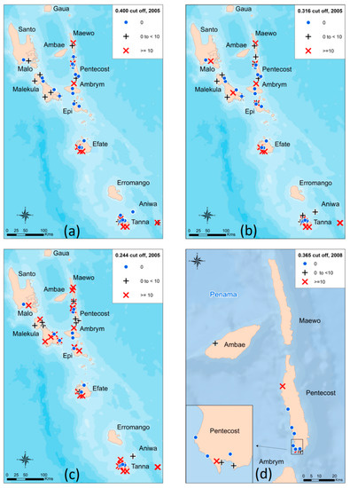 The antibody prevalence remained unchanged when utilizing the absolute cut-off value of ≥0.401 (5.9%) compared to the original manufacturer’s value of ≥0.400 (5.9%) (positives n = 11). When re-classifying the indeterminate range (n = 1) into positives by utilizing the lower 80% threshold to maximize sensitivity at the cost of specificity, the antibody prevalence increased to 6.4%, with 12 children classified as antibody positive. The antibody prevalence per village was subsequently mapped (Figure 3d). The included an antibody positive child who was located in the village of Londar, Pentecost.
